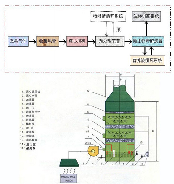 廢氣凈化塔內填料層作為氣液兩相間接觸構件的傳質設備。填料塔底部裝有填料支承板,填料以亂堆方式放置在支承板上。填料的上方安裝填料壓板,以防被上升氣流吹動。廢氣凈化塔噴淋液從塔頂經液體分布器噴淋到填料上,并沿填料表面流下。氣體從塔底送入,經氣體分布裝置分布后,與液體呈逆流連續通過填料層的空隙,在填料表面上,氣液兩相密切接觸進行傳質。當液體沿填料層向下流動時,有時會出現壁流現象,壁流效應造成氣液兩相在填料層中分布不均,從而使傳質效率下降。因此,廢氣凈化塔內的填料層分為兩段,中間設置再分布裝置,經重新分布后噴淋到下層填料上。
